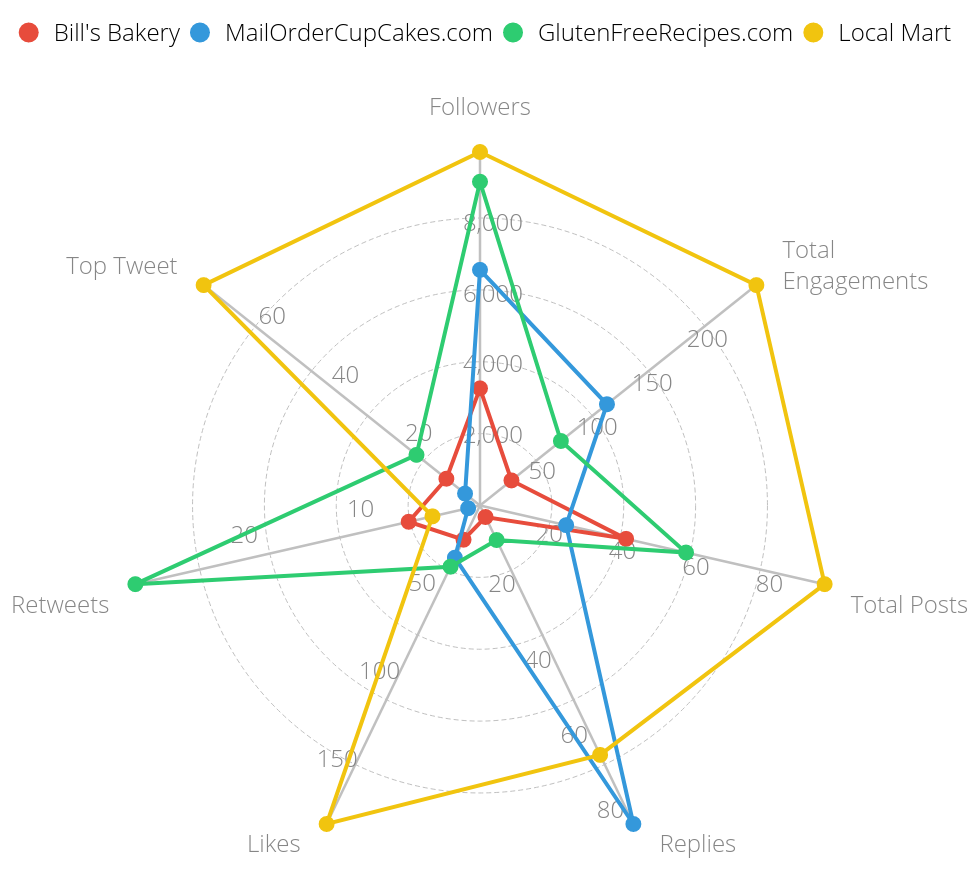 From this analysis we can see that, although GlutenFreeRecipes.com is posting a lot less than the rival with the highest volume (Local Mart) and receives many fewer likes, it’s recipe content is so shareable that it is very closely competing for follower number — so clearly this is a key way to increase Twitter reach! Having a high reply rate like MailOrderCupCakes.com doesn’t seem to boost follower number so much.